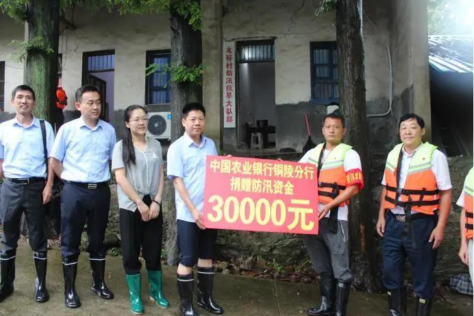 枞阳县遇灾情后,铜陵分行立即组织人员赶赴一线参加防汛工作,并向枞阳县长沙乡捐赠防汛资金3万元;井湖支行全体党员开展防汛救灾公益捐赠,为网点均配置应急雨具,解决客户燃眉之急。